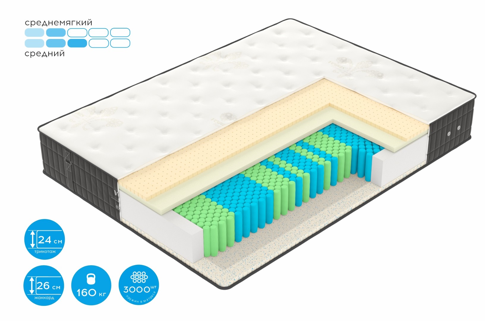 • Удобная средняя или среднемягкая жесткость с обеих сторон.
